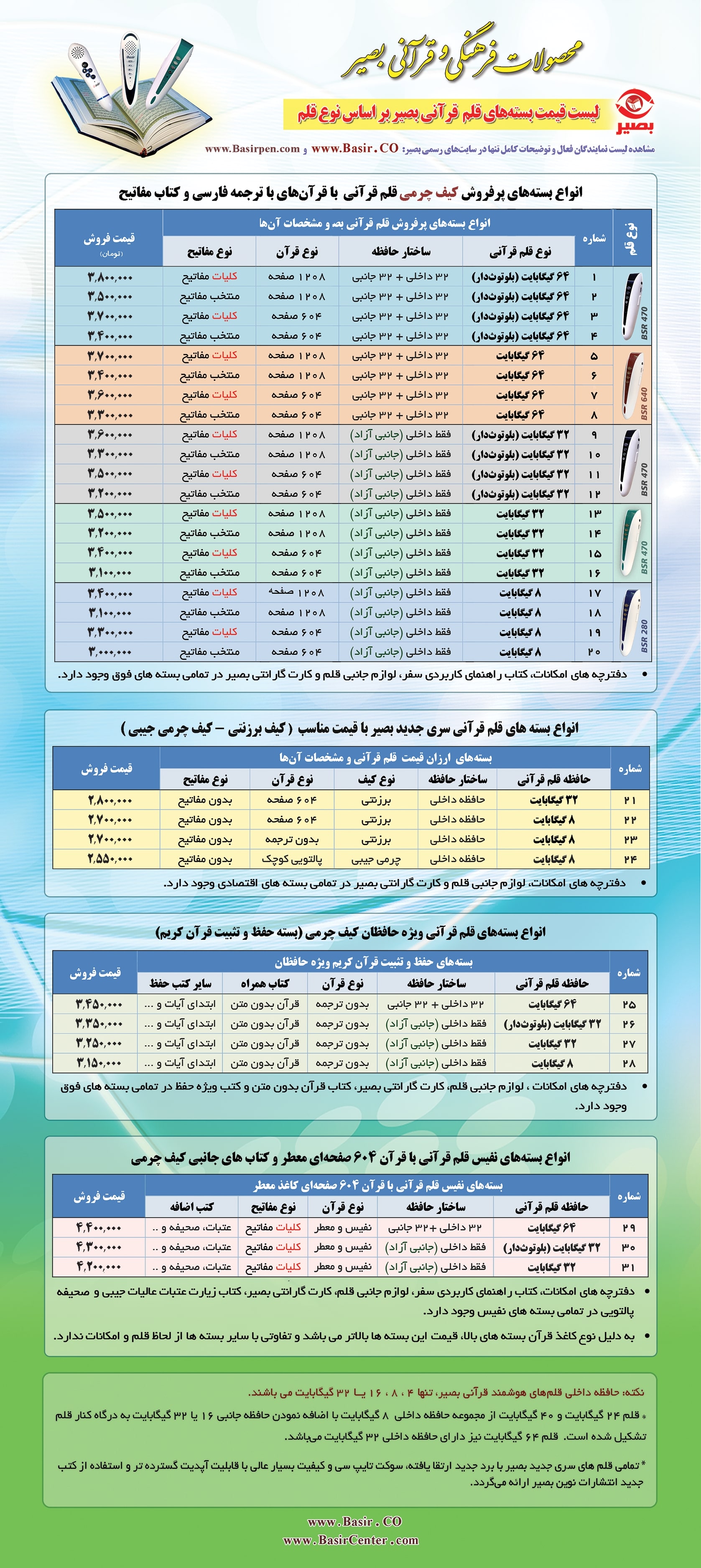 توجه: قیمت های درج شده در لیست قیمت بصیر، مربوط به قلمهای قرآنی سری جدید بصیر (با کیفیت بسیار عالی، امکانات بینظیر و با قابلیتهای نرم افزاری بسیار گستردهتر) میباشد، در صورتی که قلم موجود در بستهها با نمونه قلمهای اقتصادی بصیر جایگزین شود، مبلغ 400 هزار تومان از قیمت بسته، کسر می گردد.
