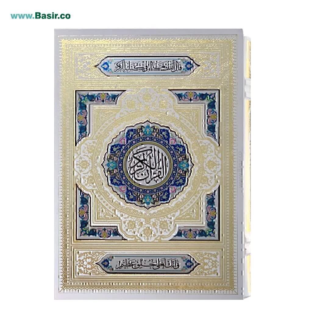 کتاب نفیس قرآن سفید پلاک نقره‌ای رنگی بصیر با قاب کشویی
