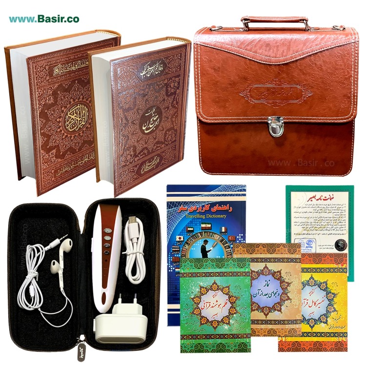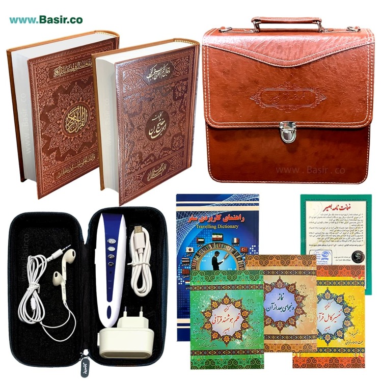 قلم قرآنی جدید بصیر با کیفیت بسیار عالی و امکانات بی نظیر همراه با کتاب قرآن بدون ترجمه (15 سطری) عثمان طه ویژه حافظان (حفظ و تثبیت قرآن کریم) به همراه 3 دفترچه اصلی شامل تمامی امکانات جانبی (صحیفه سجادیه، نهجالبلاغه، منتخب ادعیه و زیارات، داستان، سرود، سخنرانی و ... ) به همراه شارژر هدفون و کارت گارانتی داخل کیف برزنتی با قیمت بسیار مناسب و کیفیت بی نظیر و امکانات بسیار کامل.