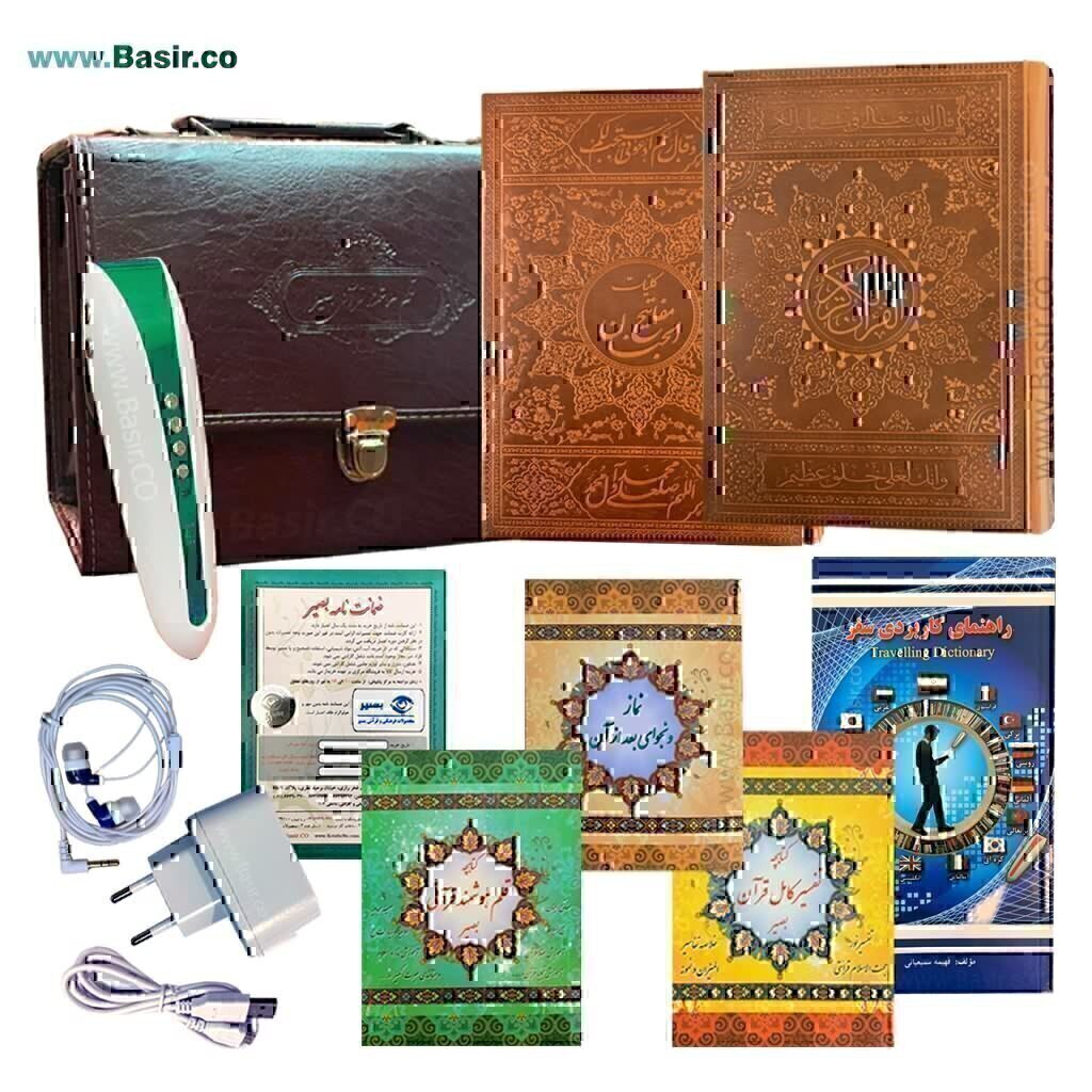این بسته کامل ترین و پرفروشترین بسته قلم قرانی بصیر که به صورت ویژه توسط موسسه فرهنگی و قرآنی بصیر عرضه می گردد .این بسته همراه با قرآن وزیری کاملا رنگی (604 صفحه) دارای ترجمه فارسی زیر، کتاب کلیات مفاتیح الجنان رنگی در قطع وزیری، سه عدد دفترچه امکانات و راهنما و با کاملترین امکانات همراه با کیف طرح چرم، با قلم هوشمند با کیفیت بسیار عالی و قابلیت به روز رسانی و استفاده از جدیدترین کتاب های تولید شده توسط موسسه بصیر گامی جدید در نسل قلم های هوشمند نهاد. این بسته از هر لحاظ مورد تائید شرکت بصیر است و نسبت به بسته های مشابه دارای کیفیت و امکانات عالی و بی نظیر است که توسط این موسسه با قیمتی مناسب و پشتیبانی عالی توزیع می گردد.