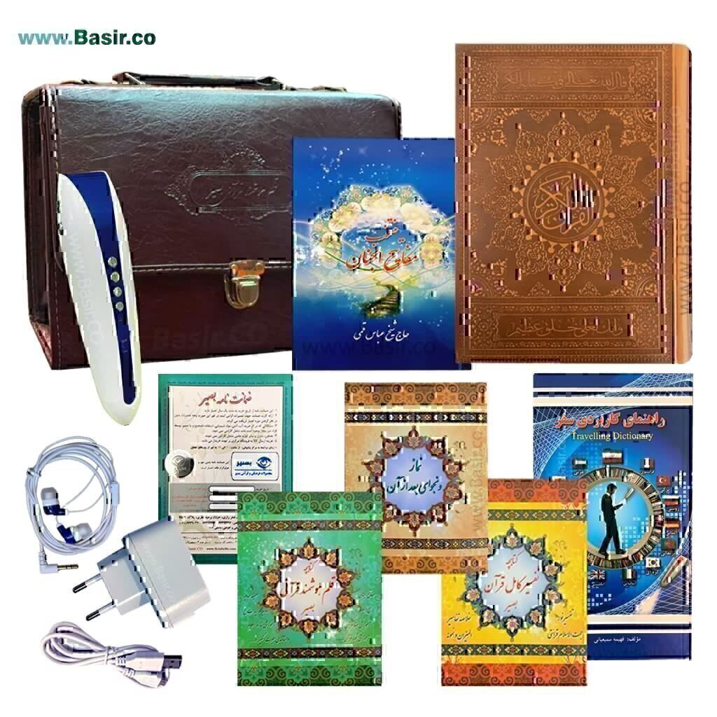 این بسته کامل ترین بسته قلم قرآنی بصیر می باشد که به صورت ویژه توسط شرکت بصیر عرضه می گردد .این بسته همراه با قرآن وزیری کاملا رنگی (604 صفحه) دارای ترجمه فارسی زیر، کتاب منتخب مفاتیح درشت خط و کاملترین امکانات همراه با کیف طرح چرم با قلم هوشمند با کیفیت بسیار عالی و قابلیت به روز رسانی و استفاده از جدیدترین کتاب های تولید شده توسط موسسه بصیر گامی جدید در نسل قلم های هوشمند نهاد. این بسته از هر لحاظ مورد تائید شرکت بصیر است و نسبت به بسته های مشابه دارای کیفیت و امکانات عالی و بی نظیر است که توسط این موسسه با قیمتی مناسب و پشتیبانی عالی توزیع می گردد.
