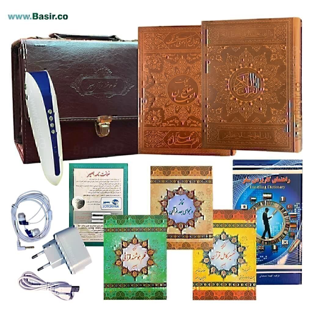 این بسته کامل ترین بسته قلم قرآنی بصیر می باشد که به صورت ویژه توسط شرکت بصیر عرضه می گردد .این بسته همراه با قرآن وزیری کاملا رنگی(604 صفحه) دارای ترجمه فارسی زیر، کتاب کلیات مفاتیح الجنان در قطع وزیری و کاملترین امکانات همراه با کیف طرح چرم با قلم هوشمند با کیفیت بسیار عالی و قابلیت به روز رسانی و استفاده از جدیدترین کتاب های تولید شده توسط موسسه بصیر گامی جدید در نسل قلم های هوشمند نهاد. این بسته از هر لحاظ مورد تائید شرکت بصیر است و نسبت به بسته های مشابه دارای کیفیت و امکانات عالی و بی نظیر است که توسط این موسسه با قیمتی مناسب و پشتیبانی عالی توزیع می گردد.