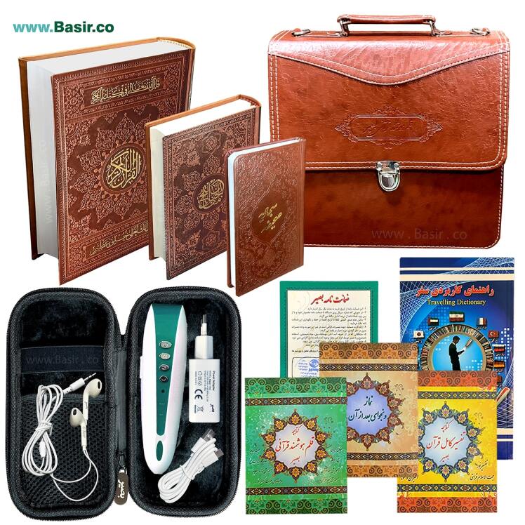کامل ترین و آخرین بسته قلم قرآنی بصیر با امکانات عالی و بی نظیر که به صورت ویژه توسط این مرکز عرضه می گردد .این بسته همراه با قرآن وزیری بسیار درشت خط (1208 صفحه ای و درشت خط ترین کتاب ویژه قلم هوشمند قرآنی) دارای ترجمه فارسی زیر، کتاب کلیات مفاتیح الجنان رنگی در قطع وزیری، دفترچه های گوناگون و کاملترین امکانات همراه با کیف طرح چرم با قلم هوشمند با کیفیت بسیار عالی و قابلیت به روز رسانی و با قابلیت استفاده از جدیدترین کتاب های تولید شده توسط موسسه بصیر گامی جدید در نسل قلم های هوشمند نهاد. این بسته از هر لحاظ مورد تائید شرکت بصیر است و نسبت به بسته های مشابه دارای کیفیت و امکانات عالی و بی نظیر است که توسط این موسسه با قیمتی مناسب و پشتیبانی عالی توزیع می گردد. همچنین مجوز سازمان دارالقرآن جمهوری اسلامی ایران در انتهای کتاب قرآن این بسته چاپ شده و قلم قرآنی دارای کیفیت عالی با یک سال گارانتی تعویض و سه سال خدمات پس از فروش می باشد.