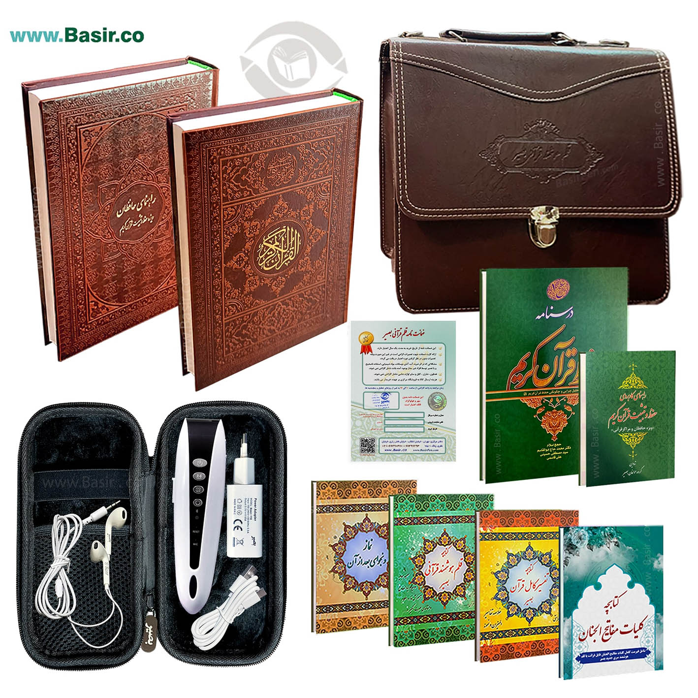 کتاب نفیس قرآن 15 سطری بدون ترجمه فارسی ویژه حفظ قرآن جلد ترمو (چرمی) قطع وزیری، کتاب قرآن بدون متن قطع وزیری جلد طرح چرم ترمو (قابل قرائت با قلم قرآنی) ، کتاب راهنمای کاربردی حفظ و تثبیت قرآن کریم قابل قرائت با قلم هوشمند قرانی (فقط چند کلمه ابتدای آیات جهت یادآوری)، کتاب درسنامه حفظ قرآن کریم، دفترچه های گوناگون شامل تمامی امکانات جانبی و راهنما، کتابچه کلیات مفاتیح الجنان شامل تمامی ادعیه و زیارات به صورت فهرست کامل، کارت گارانتی بصیر، هدفون، شارژر، کابل جدید تایپ سی (USB Type - C)، قلم قرآنی به همراه کیف محافظ.