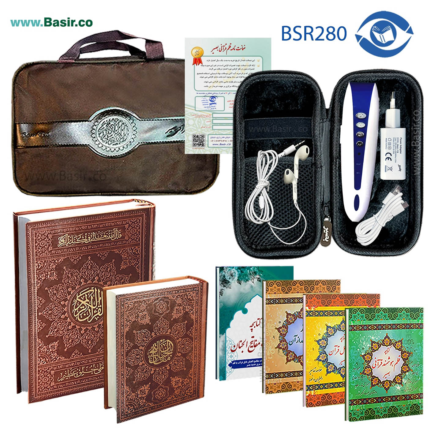 قلم قراني 8 گیگابایت مدل BSR280 همراه با کیف مخصوص، کتاب قرآن خط عثمان طه با ترجمه فارسی در قطع وزيري، کتاب منتخب مفاتیح الجنان در قطع جیبی، دفترچه قلم هوشمند قرآنی (شامل راهنما، استفاده آسان از قلم هوشمند بدون کتاب، دکمه هاي کنترلي و تمامي امکانات جانبي شامل منتخب مفاتيح، صحيفه سجاديه، نهج البلاغه و ...)، دفترچه کلیات مفاتیح، کتابچه تفسير کامل قرآن (قرائت هر آیه از هر سوره تنها با یک اشاره) ، دفترچه نماز و نجواي بعد از آن، شارژر، هدفون، کابل USB جهت اتصال به رايانه، کارت گارانتي .