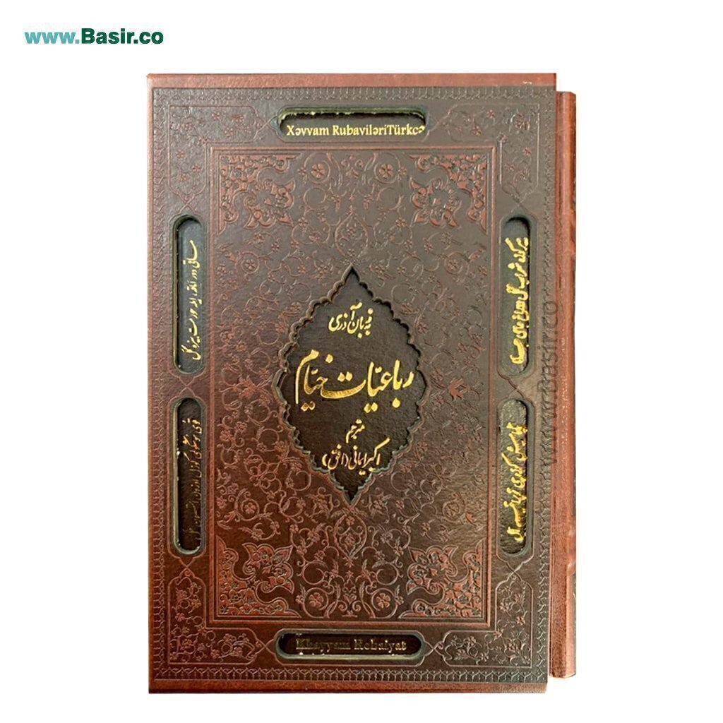 کتاب رباعیات خیام نفیس همراه با قاب کشویی طرح لیزری بصیر، متن نستعلیق به همراه ترجمه ترکی آذری، انگلیسی و ....