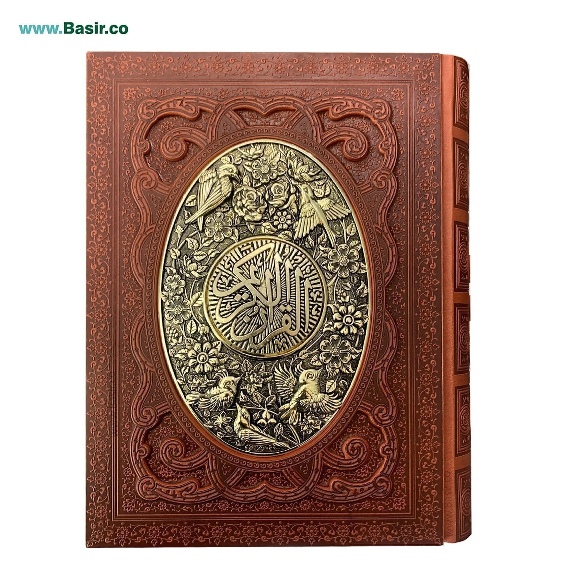 کتاب نفیس و معطر قرآن کریم در قطع وزیری همراه با جلد و جعبه (قاب بازشو) چرمی کار شده با مس