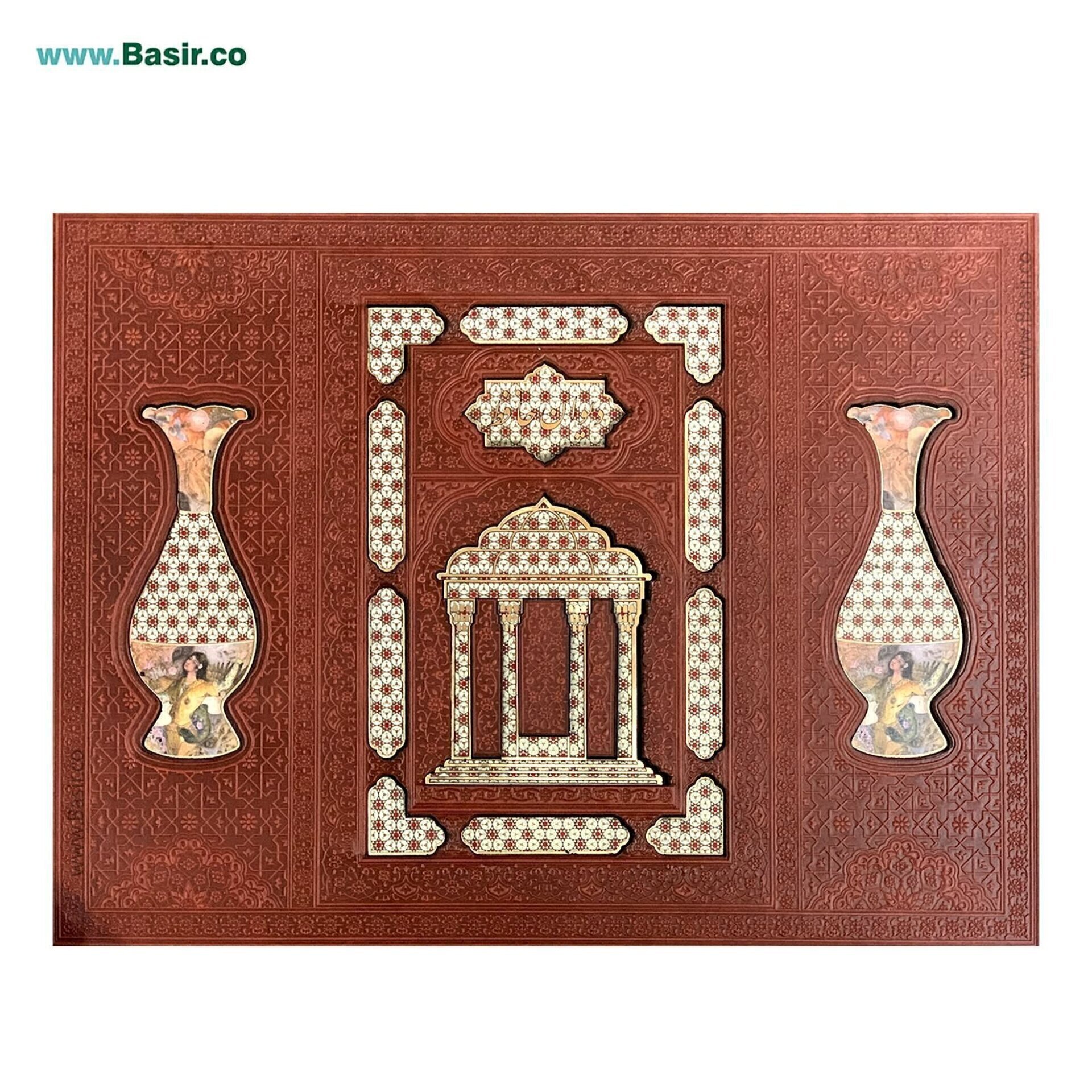 مجموعه نفیس و بسیار زیبا کتاب دیوان حافظ نفیس لبه تصویر همراه با جعبه لپتاپی چرمی و دو گلدان خاتم بسیار زیبا که با طرحی فوق العاده و چشم نواز تولید شده است. این مجموعه شامل یک کتاب نفیس دیوان حافظ در قطع وزیری با کاغذ گلاسه و تذهیب زیبا در داخل جعبه با دو گلدان بسیار زیبا خاتم در اطراف کتاب طراحی شده و هدیه ای بسیار نفیس و ماندگار به شمار می رود. این مجموعه توسط این مرکز (انتشارات نوین بصیر) با تخفیف های عالی در سراسر ایران توزیع می گردد.