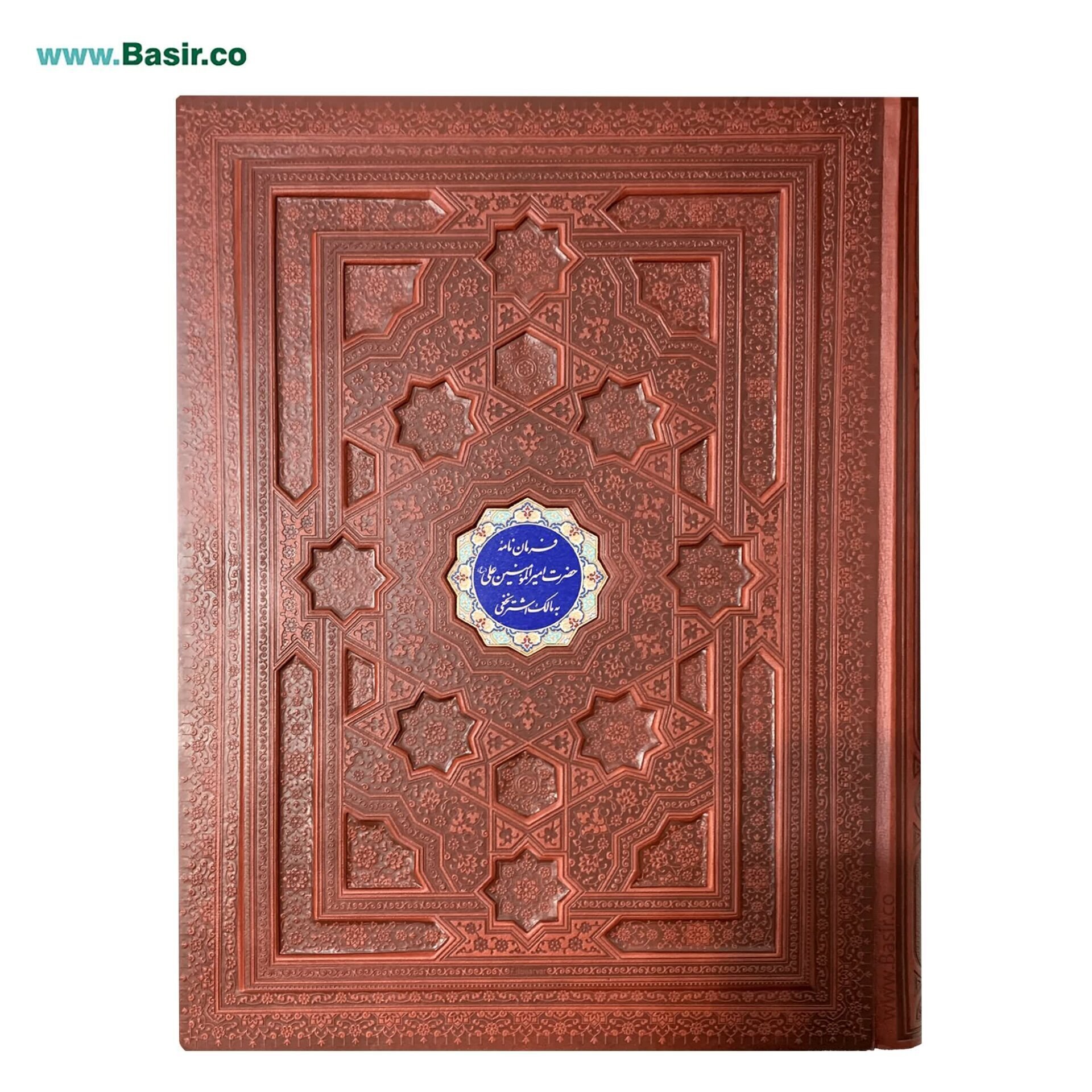 کتاب نفیس و معطر فرمان نامه حضرت علی (ع) به مالک اشتر همراه با جلد چرمی برجسته و قاب بازشو (جعبه صندوقی) با حاشیه و تصاویر بسیار زیبا و چاپ 5 رنگ عالی بر روی کاغذ معطر مارگانو (طرح ابرو باد).