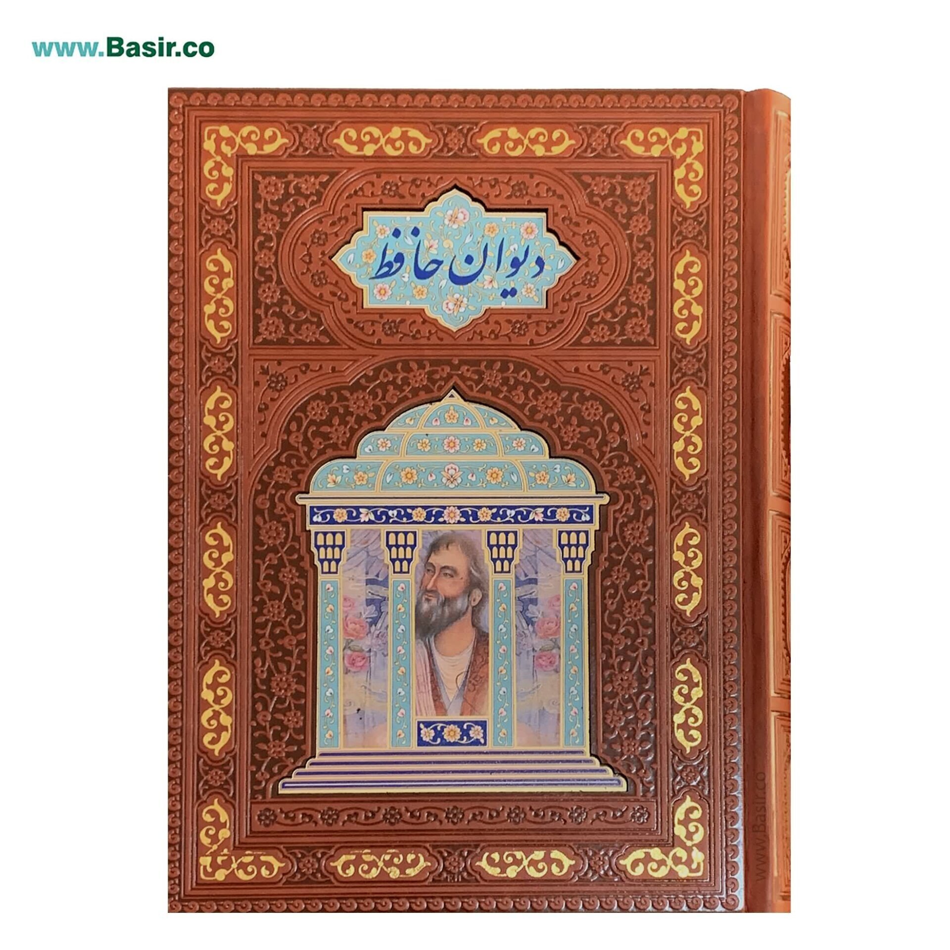 کتاب نفیس دیوان حافظ چرمی پلاک دار کاملا مصور لبچاپ در قطع وزیری با کاغذ گلاسه و طرح زیبای مقبره حافظ که به صورت تک و یا در تعداد بالا توسط انتشارات نوین بصیر در سراسر ایران توزیع می گردد.