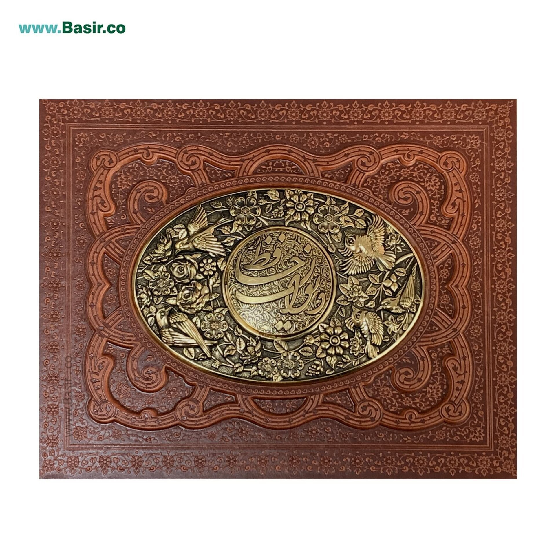 کتاب نفیس و معطر دیوان حافظ همراه با قاب بازشو (جعبه) لپتاپی طرح چرم و مس بسیار زیبا و نفیس در قطع وزیری با کاغذ معطر مارگانو طرح ابر و باد و کیفیت عالی که به صورت تک و یا در تعداد بالا توسط انتشارات نوین بصیر در سراسر ایران توزیع می گردد.