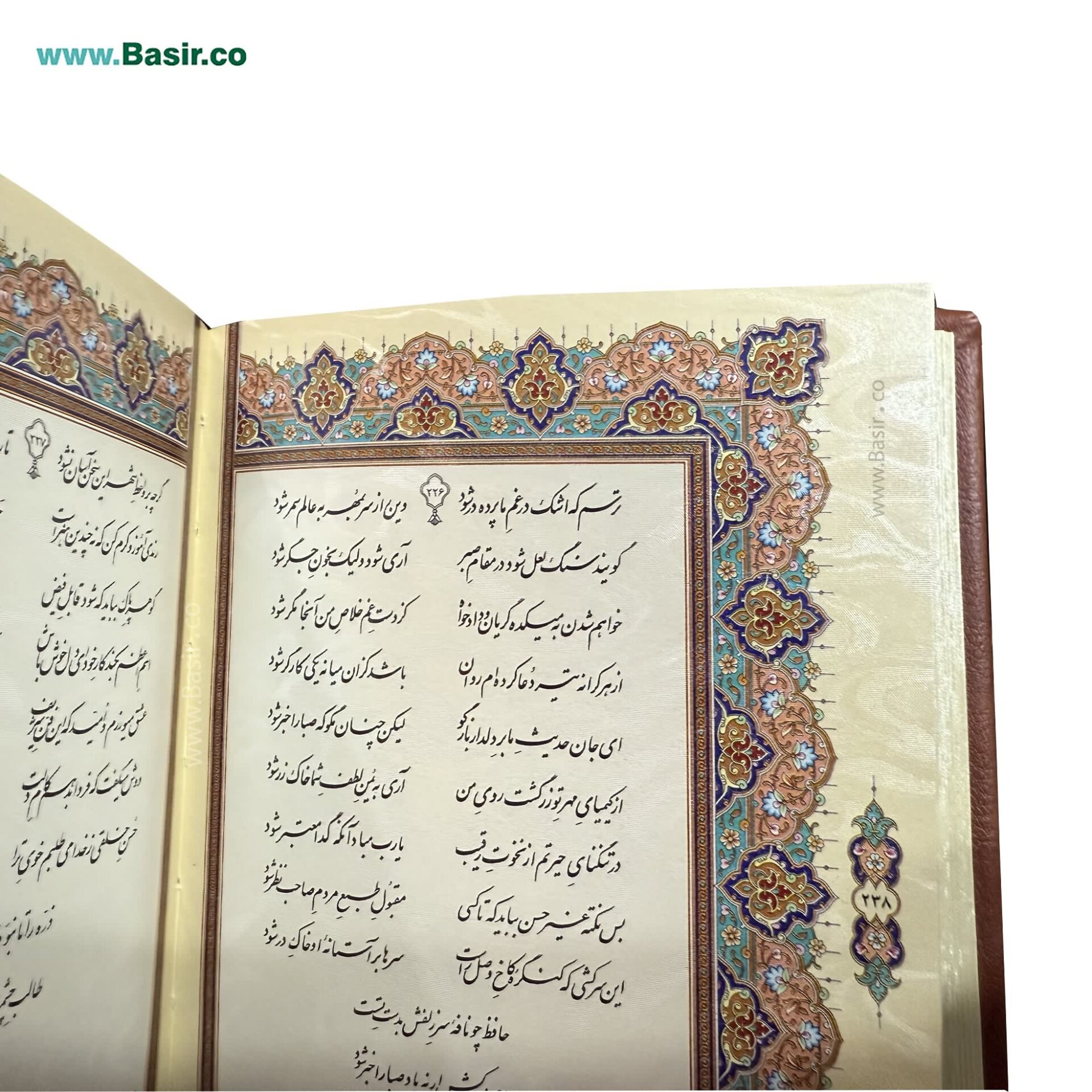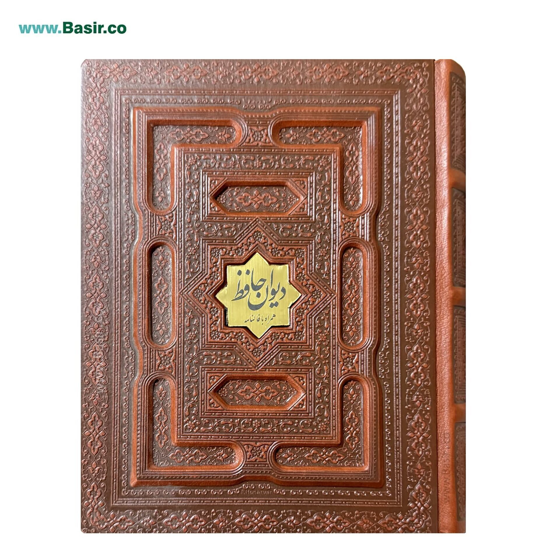 کتاب نفیس و معطر دیوان حافظ در قطع وزیری همراه با جلد و جعبه چرمی (ترمو) طرح برجسته زیبا با چاپ کاملا رنگی و کاغذ معطر مارگانو طرح ابر و باد که به صورت تک یا در تعداد بالا توسط انتشارات نوین بصیر توزیع می گردد.