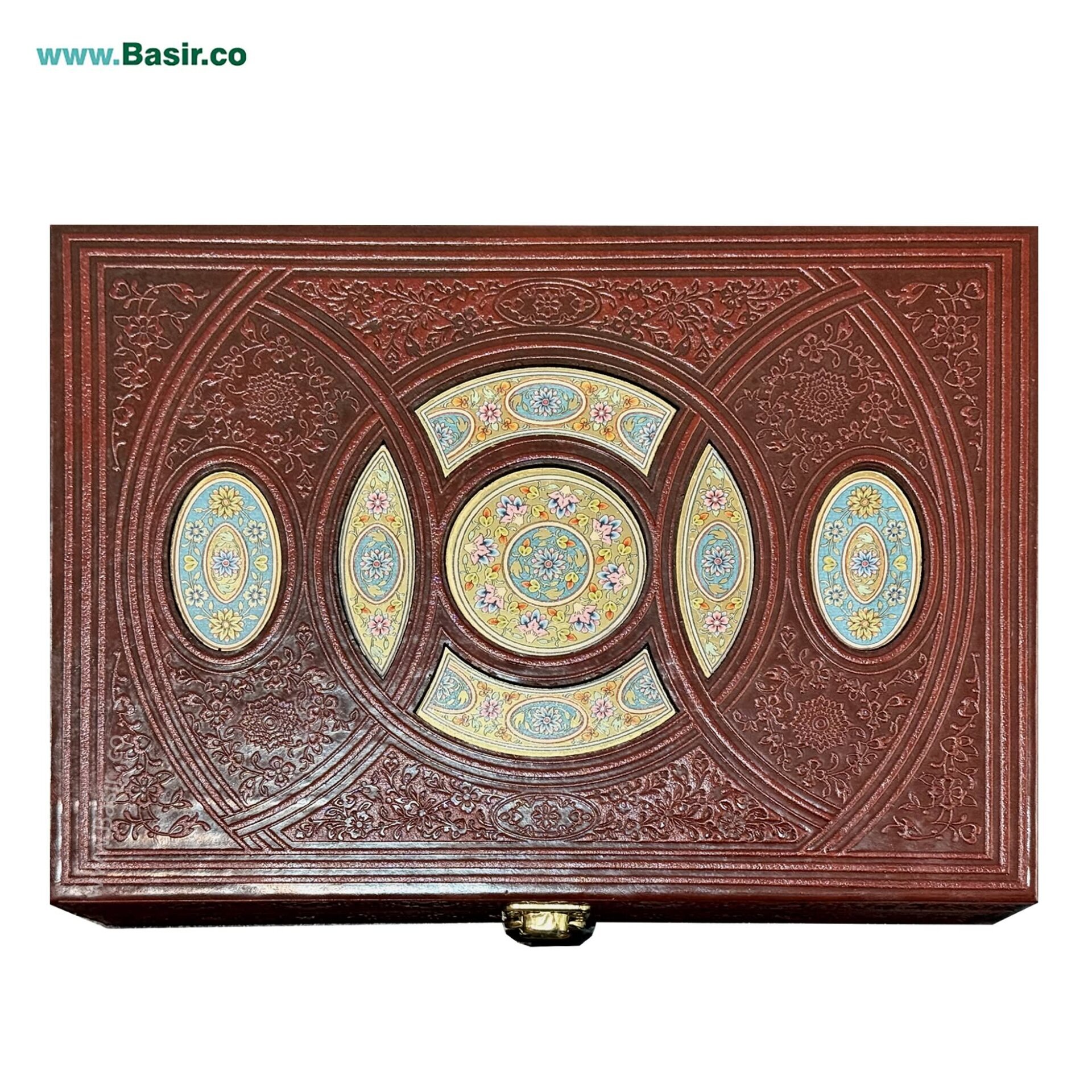 این مجموعه نفیس و زیبای شامل یک عدد کتاب حافظ در قطع کوچک پالتویی همراه با دو عدد گلدان بسیار زیبای فیروزه اصفهان داخل جعبه چرمی با پلاک رنگی می باشد.