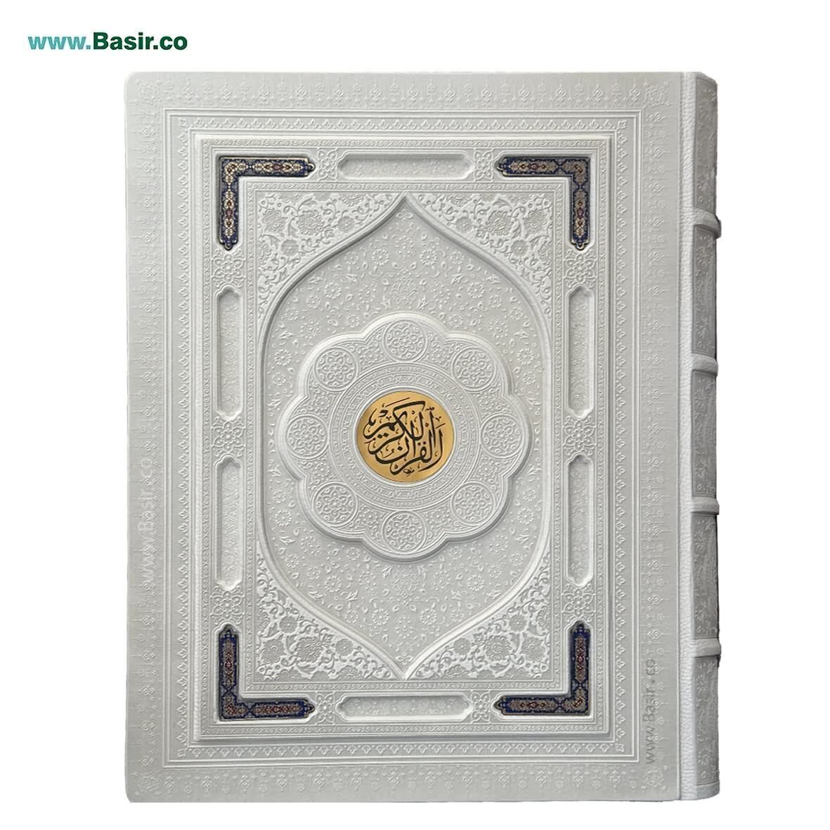 کتاب بسیار زیبا و نفیس قرآن کریم سفید (قرآن عروس) در قطع بزرگ رحلی همراه با جلد و قاب طرح برجسته زیبا
