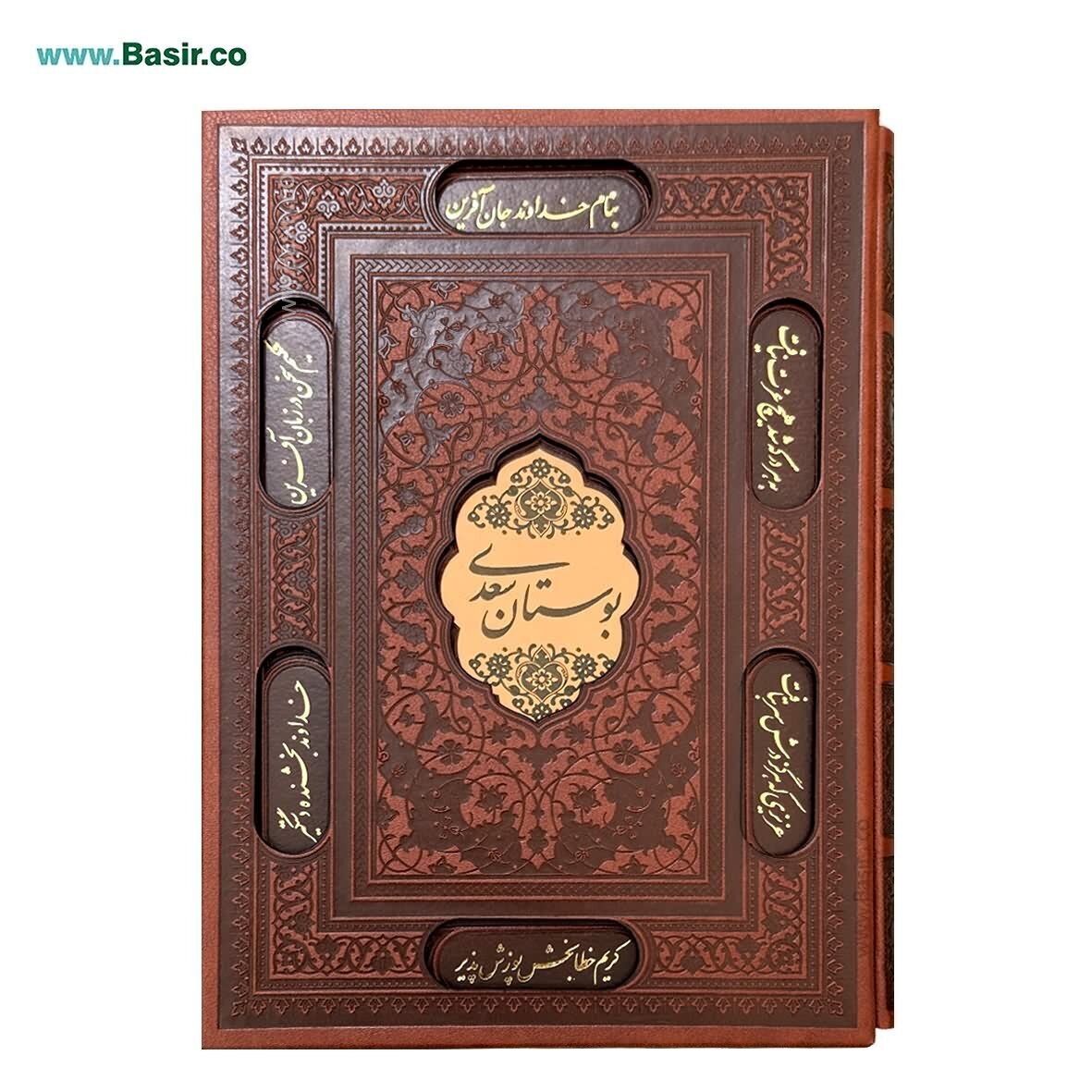 کتاب نفیس بوستان سعدی چرمی (ترمو) همراه با قاب کشویی برش لیزری زیبا و چاپ کاملا رنگی و تذهیب زیبا با کاغذ گلاسه هدیه ای ارزشمند برای تمامی افراد که به صورت تک یا در تعداد بالا به صورت مستقیم و با تخفیف های ویژه توسط موسسه بصیر در سراسر ایران توزیع می گردد.