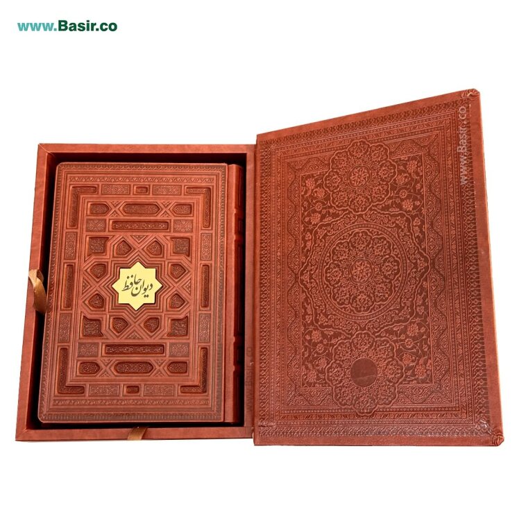 این مجموعه شامل دو کتاب غزلیات حافظ نفیس با کاغذ معطر و جلد چرمی (ترمو) و کتاب رباعیات خیام نفیس با کاغذ معطر و جلد چرمی (ترمو) می باشد که داخل یک عدد قاب بازشو (جعبه) نفیس چرمی با طرح برجسته قرار گرفته است.